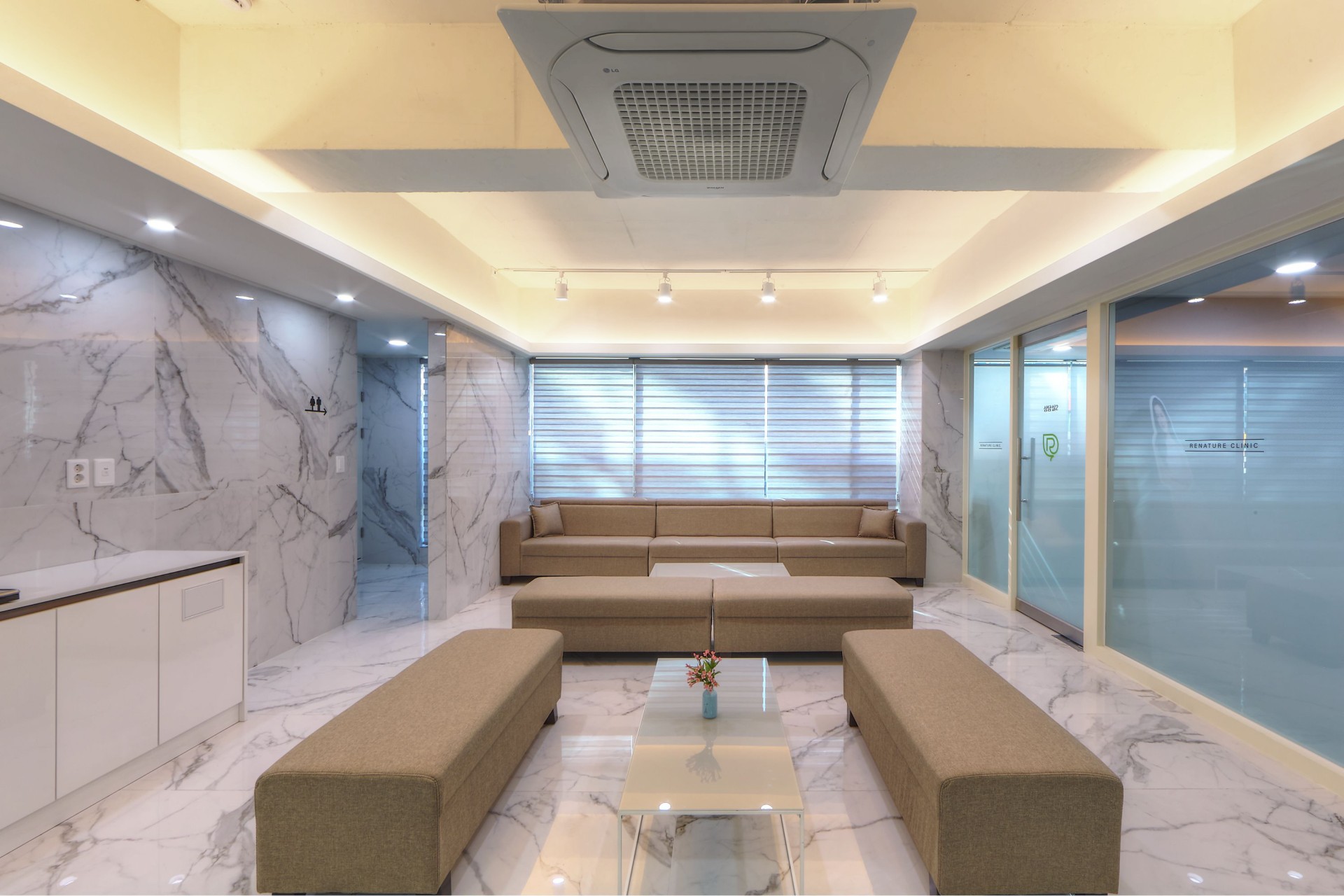 이번 프로젝트는 화이트 마블 타일을 바닥과 벽면에 일관되게 적용하여 위생적이고 고급스러운 첫 인상을 형성하고 특유의 자연스러운 결로 공간의 세련된 흐름을 주었습니다. 베이지 패브릭 소파로 긴장감을 완화하고 따뜻한 컬러의 천장 간접조명으로 부드러운 분위기를 디자인하였습니다.