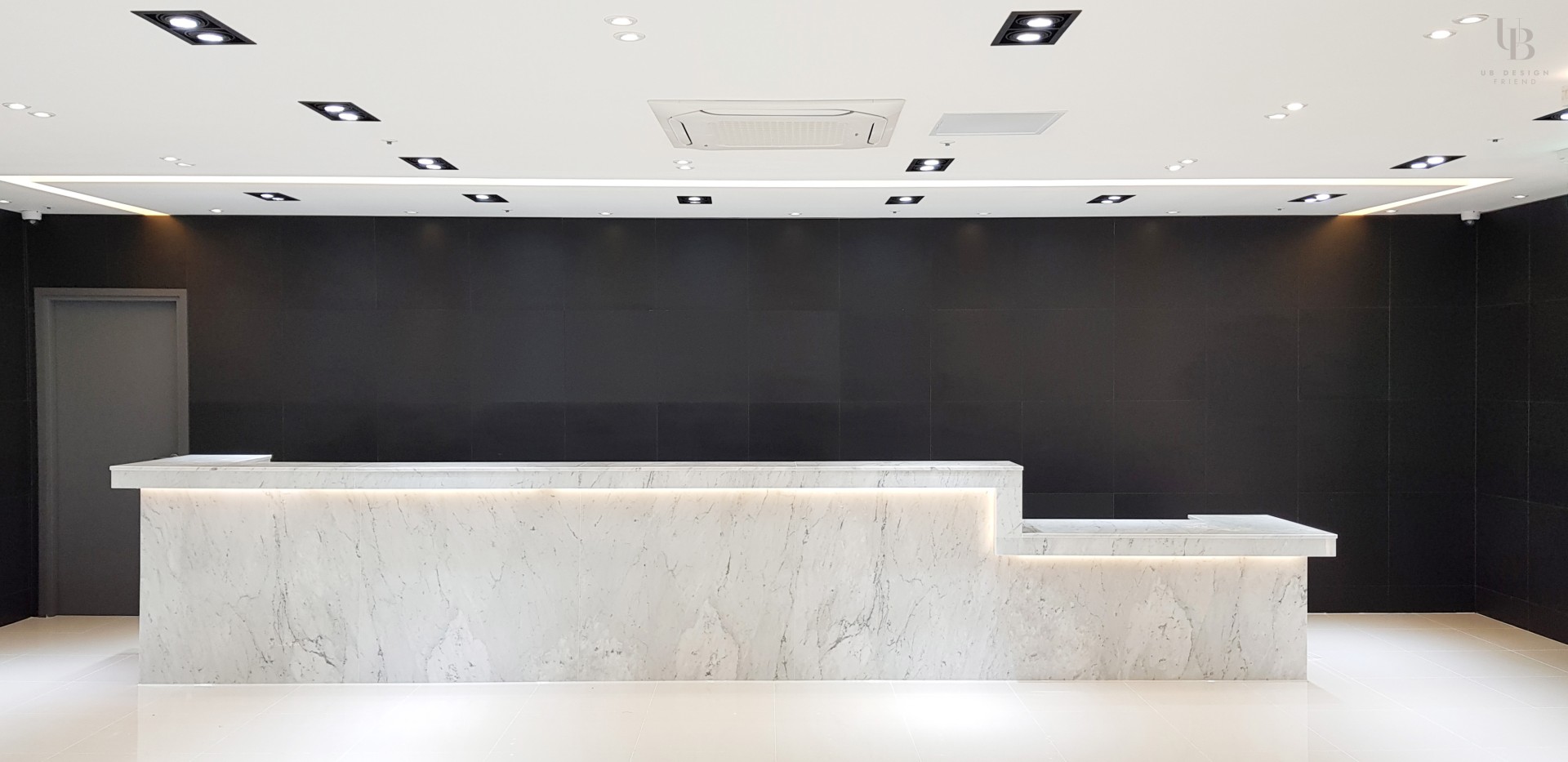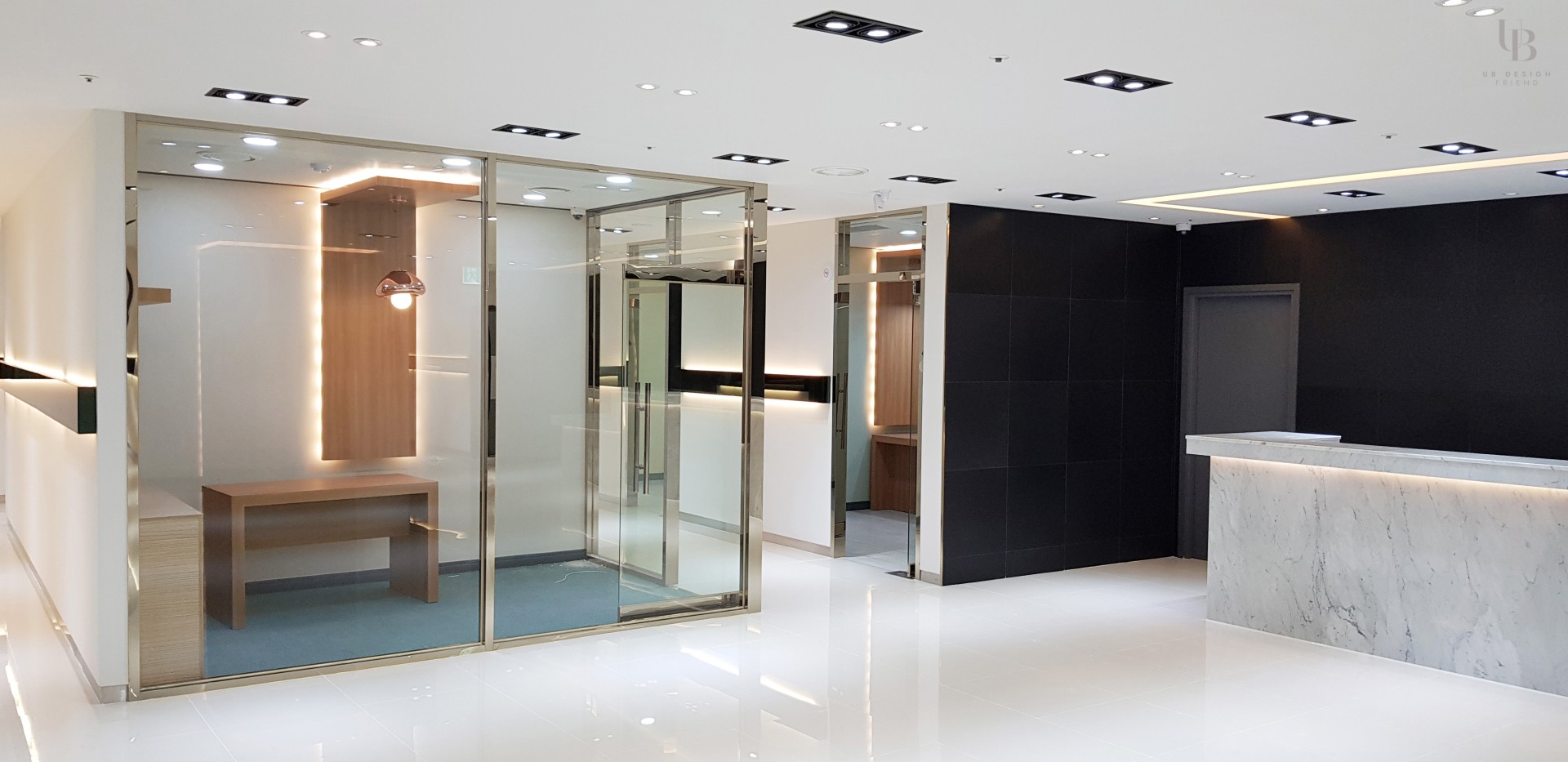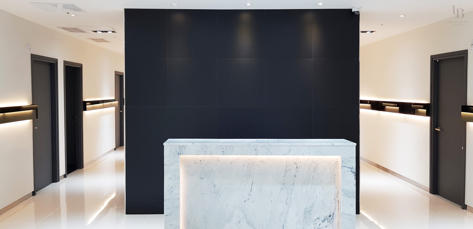 이번 프로젝트는 모던 클래식 컨셉으로 고급스러운 분위기의 피부과 디자인입니다. 네이비 컬러로 무게감을 잡고 금속 및 유광 타일의 조합으로 럭셔리한 분위기를 연출했습니다. 전체적으로 직선적인 요소를 사용하되 웨인스코팅과 화이트 톤의 벽타일이 포인트로 클래식함과 미니멀을 조합하여 트렌디한 컨셉을 녹여내고자 합니다.